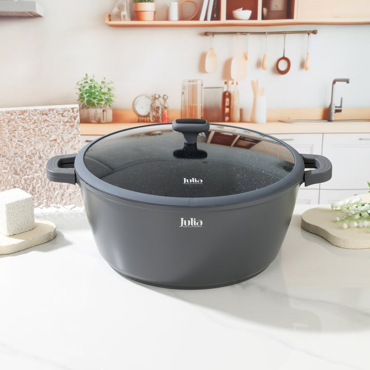 Elevate your everyday meals with the Julia Elite Edge Casserole– a perfect blend of style, performance, and durability. This 36cm non-stick Casserole features a sleek gray exterior and a double-layer black marble non-stick interior that is PTFE- and PFOA-free, ensuring safe, healthy cooking with easy food release and simple cleanup.